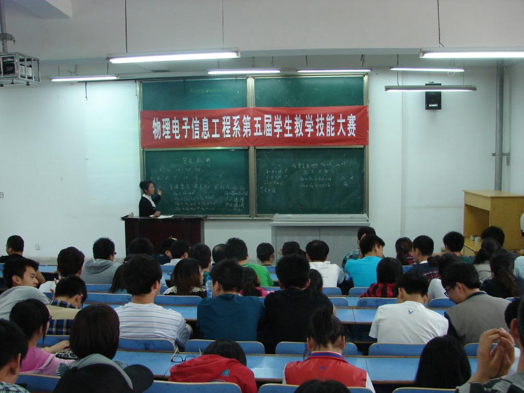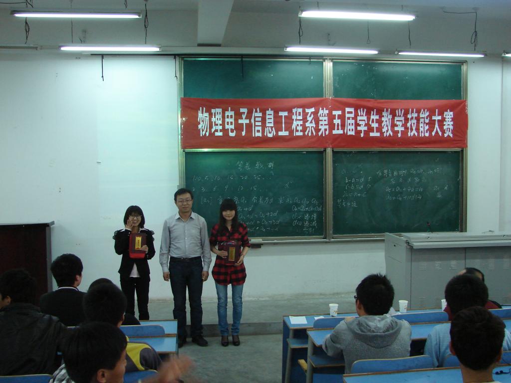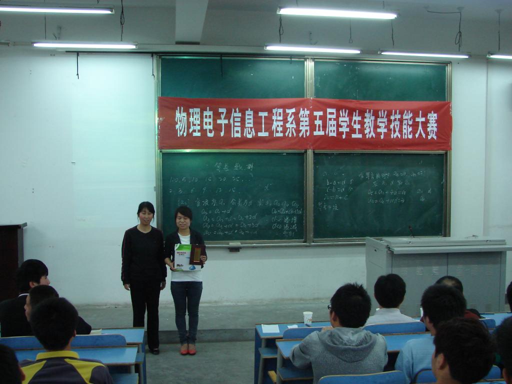 本届大赛由系团总支员工会精心策划,认真组织。有20多名选手参加预赛,最终有8名选手脱颖而出进入决赛。比赛中,吴婷同学用幽默简洁的语言讲解了“简单的随机抽样”,台上台下气氛轻松和谐。杨一帆同学紧跟社会热点,用一个简单的小故事为同学们解释了“次贷危机”产生的原因。靳巧丽同学用生动的例子来引出压强的概念及公式,在不断和同学们的互动中带动了课堂的活跃气氛。张清同学讲了“余弦定理的证明及其应用”,板书工整认真,内容深入浅出。参赛选手用自己对课堂教学的不同理解给同学们展示了一个丰富多彩且内容充实的课堂场景。