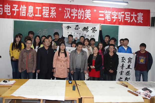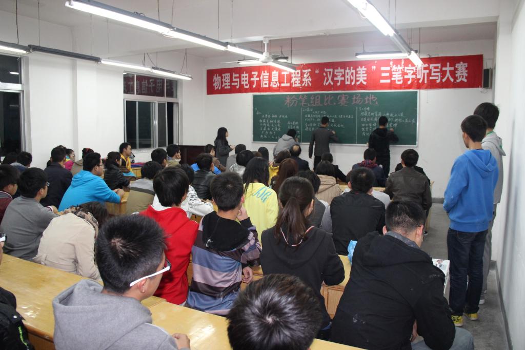 本次比赛分毛笔、粉笔、钢笔三种形式。从10月22日开始的各班初赛参加人数257人到复赛时的139人,直至10月30日进入决赛的毛笔组9人、钢笔组9人、粉笔组9人,物理与电子信息工程系共计270人参与到这个活动中。