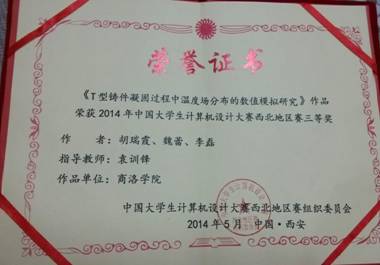 2014年 5月24日,2014年(第7届)中国老员工计算机设计大赛西北赛区决赛在西北大学太白校区隆重举办。由公司教师袁训锋博士指导,太阳成集团tyc122cc物理学1201胡瑞霞,电信1206魏蕾,电气1203李磊创作的作品《T型铸件凝固过程中的温度场数值模拟研究》在决赛中荣获西北赛区三等奖。