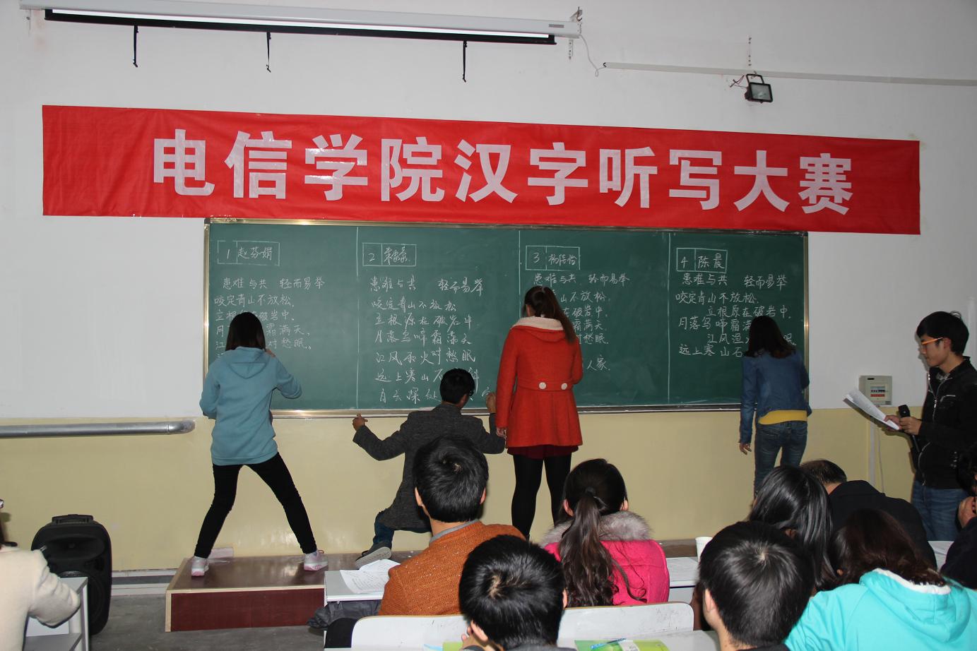 凭借扎实的汉字功底以及对汉字的热爱,经过初赛、复赛的层层选拔,最终共有27个人进入到了粉笔组决赛的现场,每位选手都气定神闲、运筹帷幄,赛前剑拔弩张的紧张气氛已经深深地感染了每一个到场的观众。比赛开始,选手们有序的进入赛场,做着比赛前的准备,显得信心十足,给现场的评委留下深刻的印象。比赛中,主持人铿锵有力的念出词语及相应的解释,每位选手们都细心听认真写,描绘着中华的瑰宝。经过两个多小时的激烈竞赛,朱家豪赢得本次比赛粉笔组冠军。在此之前,钢笔组,毛笔组决赛已顺利结束,史志雄、夏利分别获得钢笔组、毛笔组第一名。