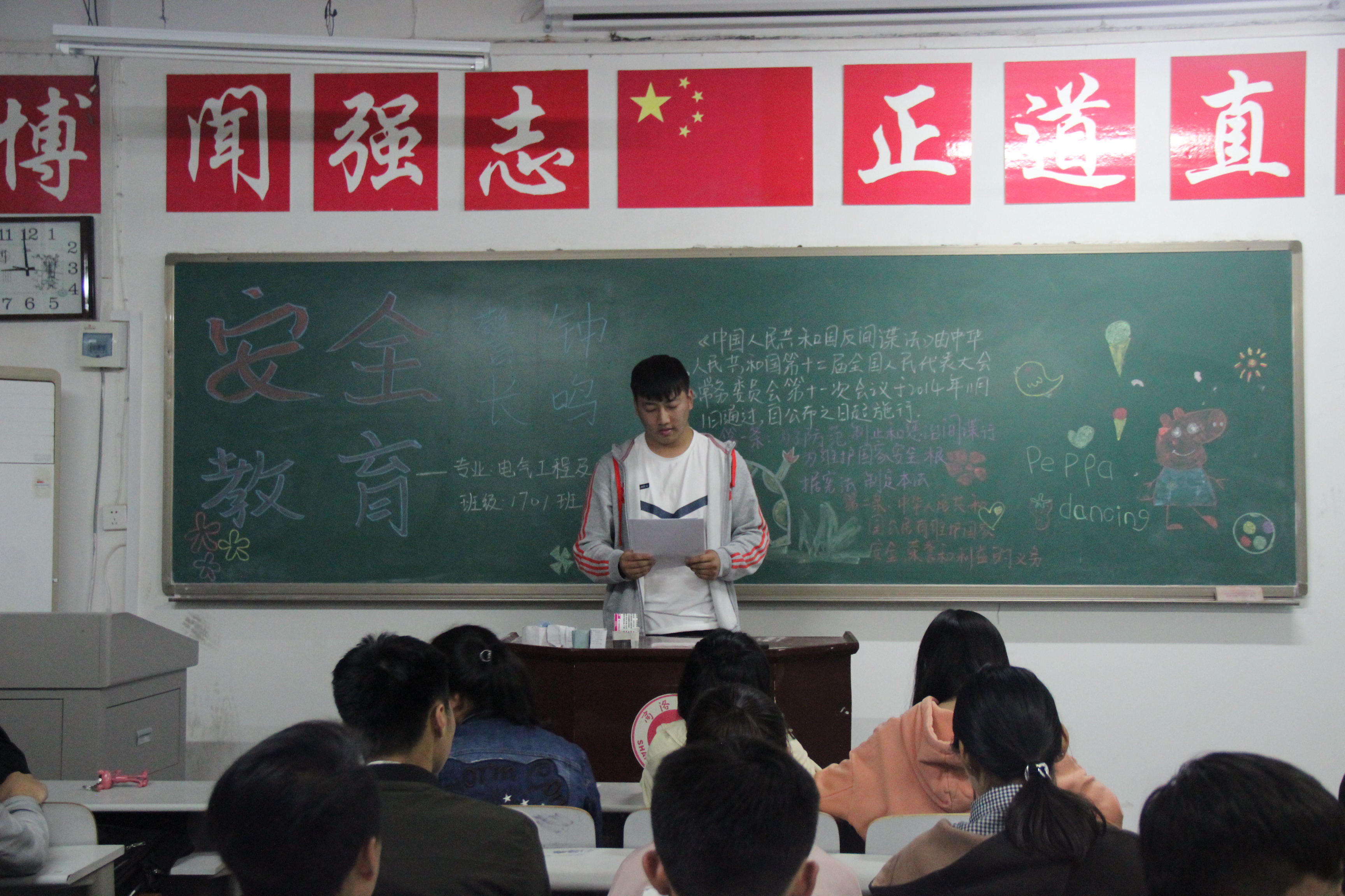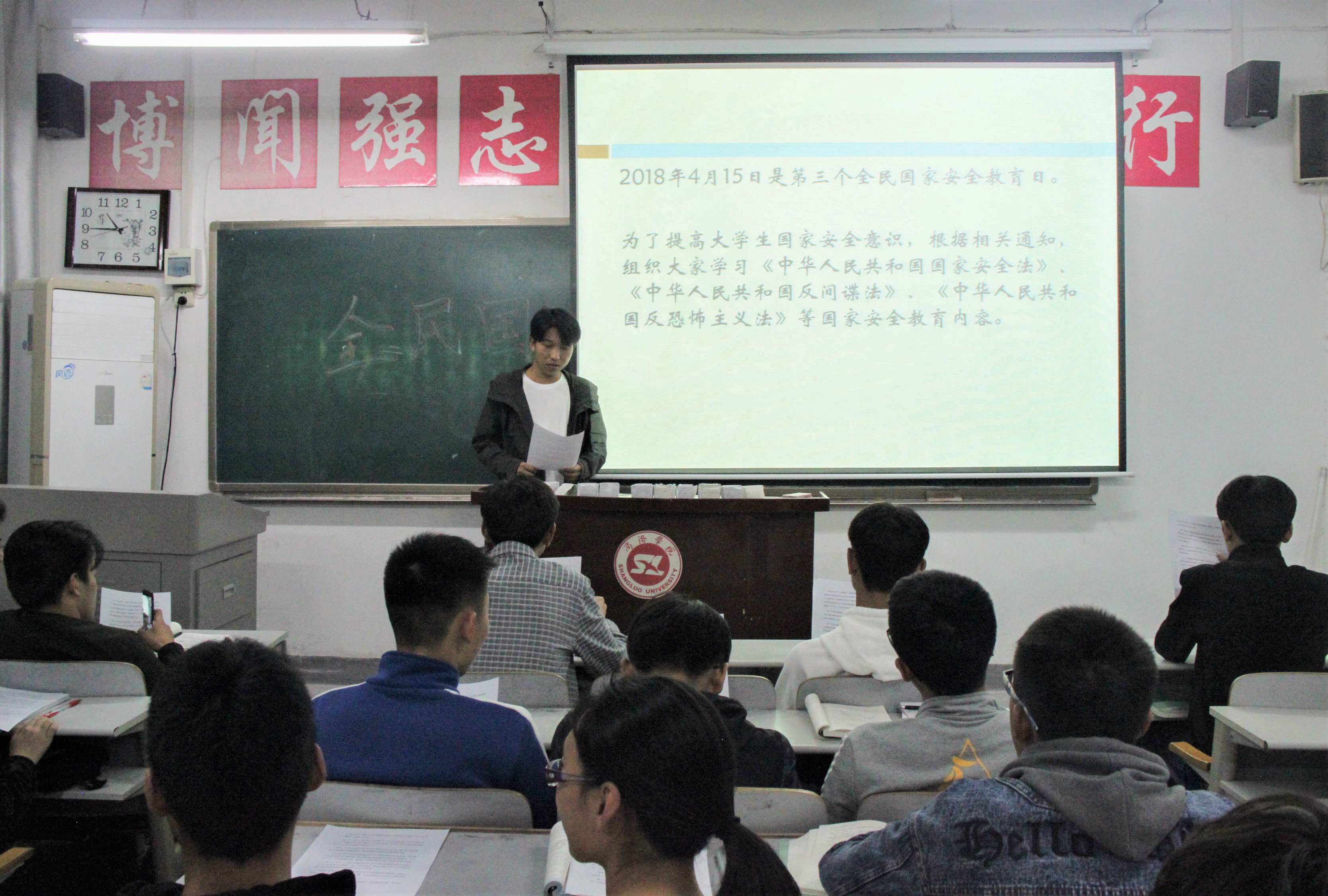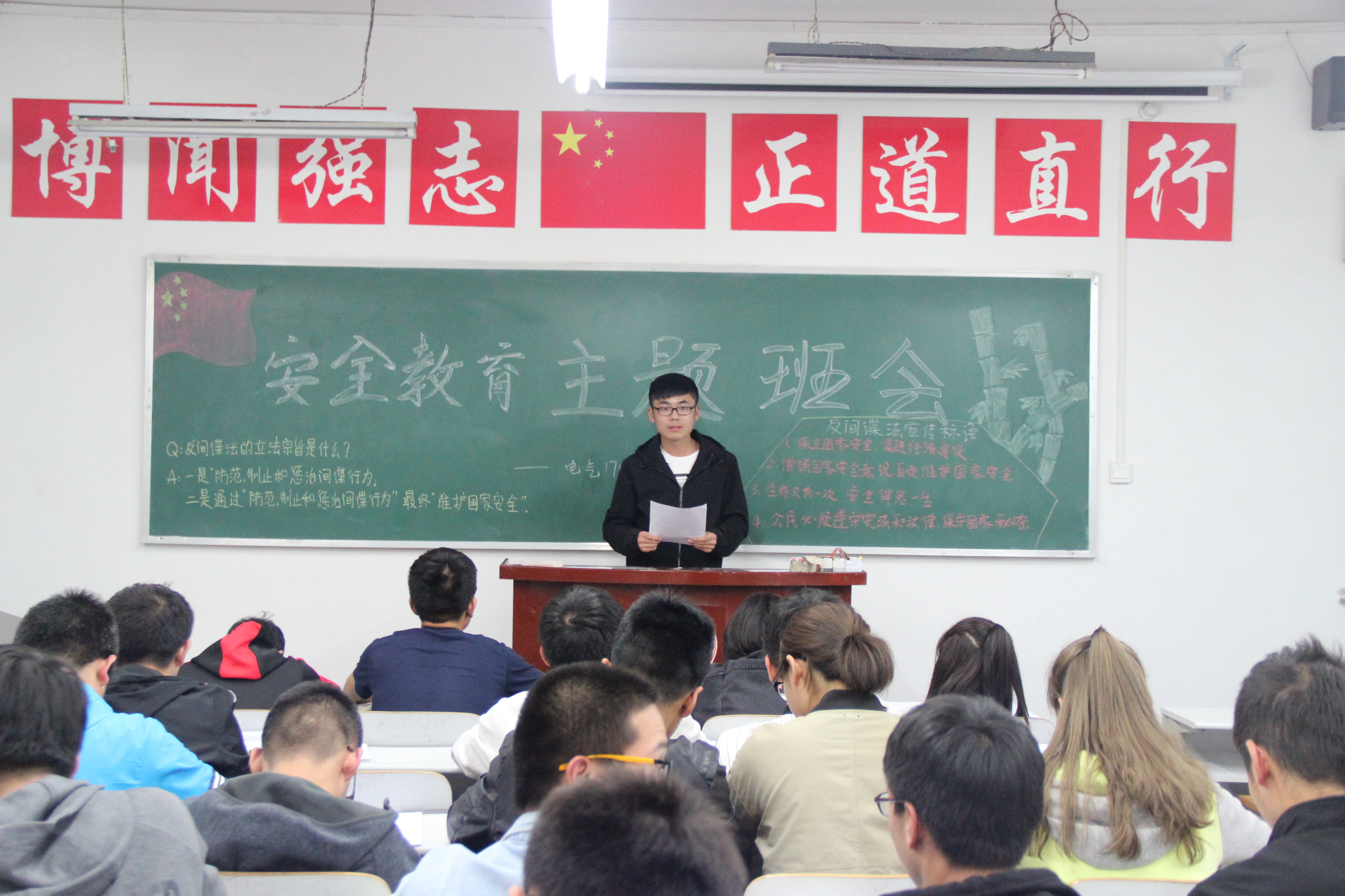 主题班会以此次宣传活动为契机,借周末班会时间,由各班班长组织各班同学学习《中华人民共和国国家安全法》《中华人民共和国反间谍法》《中华人民共和国反恐怖主义法》。班会过程中各班班长结合班级自身情况,采取制作PPT,宣读文件,制作主题板报等多种方式宣传三部法律,便于同学们接受和理解此次活动的主题,营造“国家安全 人人有责”的浓厚氛围。