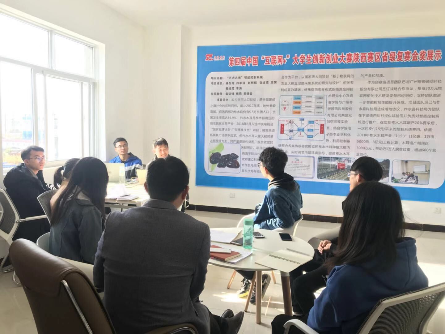 10月24日,公司获得第四届中国互联网+老员工创新创业大赛省级复赛金奖的项目团队,在指导老师袁训锋博士的带领下来到沙河子镇商洛高新区创新创业示范园召开项目推进会,正式入驻工作室。