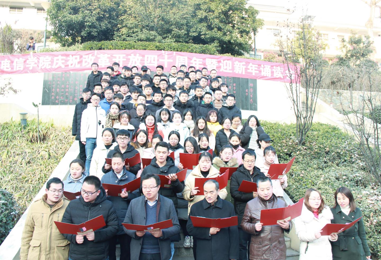 为了庆祝改革开放四十周年,深入学习领会习近平总书记在庆祝改革开放四十周年大会上的重要讲话精神,12月28日,电子信息与电气工程公司党总支在莘子园举办庆祝改革开放四十周年暨迎新年诵读大会。公司党政领导班子成员、师生党员代表和积极分子全员参会。大会由员工党支部书记唐龙龙和任艳主持。