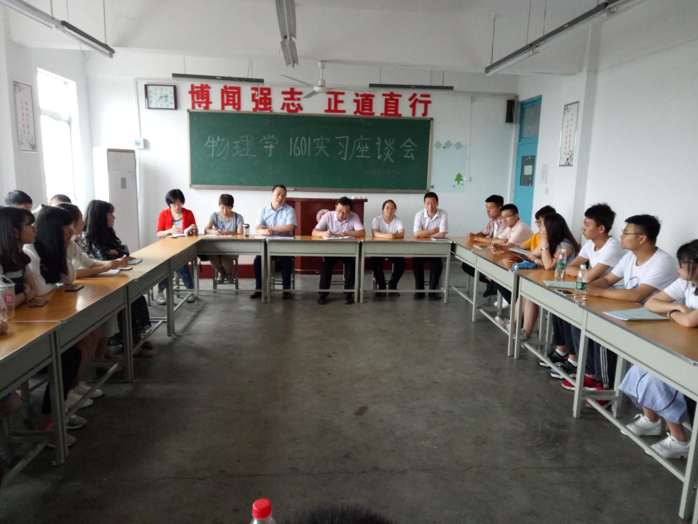 6月27日,太阳成集团tyc122cc在2-215教室召开“2016级物理学专业新疆顶岗实习总结座谈会”。经理袁训锋、副经理刘爱军出席会议,党政办公室主任兼实习指导教师杨延锋、物理系主任李书婷、辅导员沈光美、教学技能校内指导教师侯茹、教学秘书刘俊、2016级全体物理学专业员工以及2017级物理学专业5名员工代表参加了会议。会议由刘爱军主持。