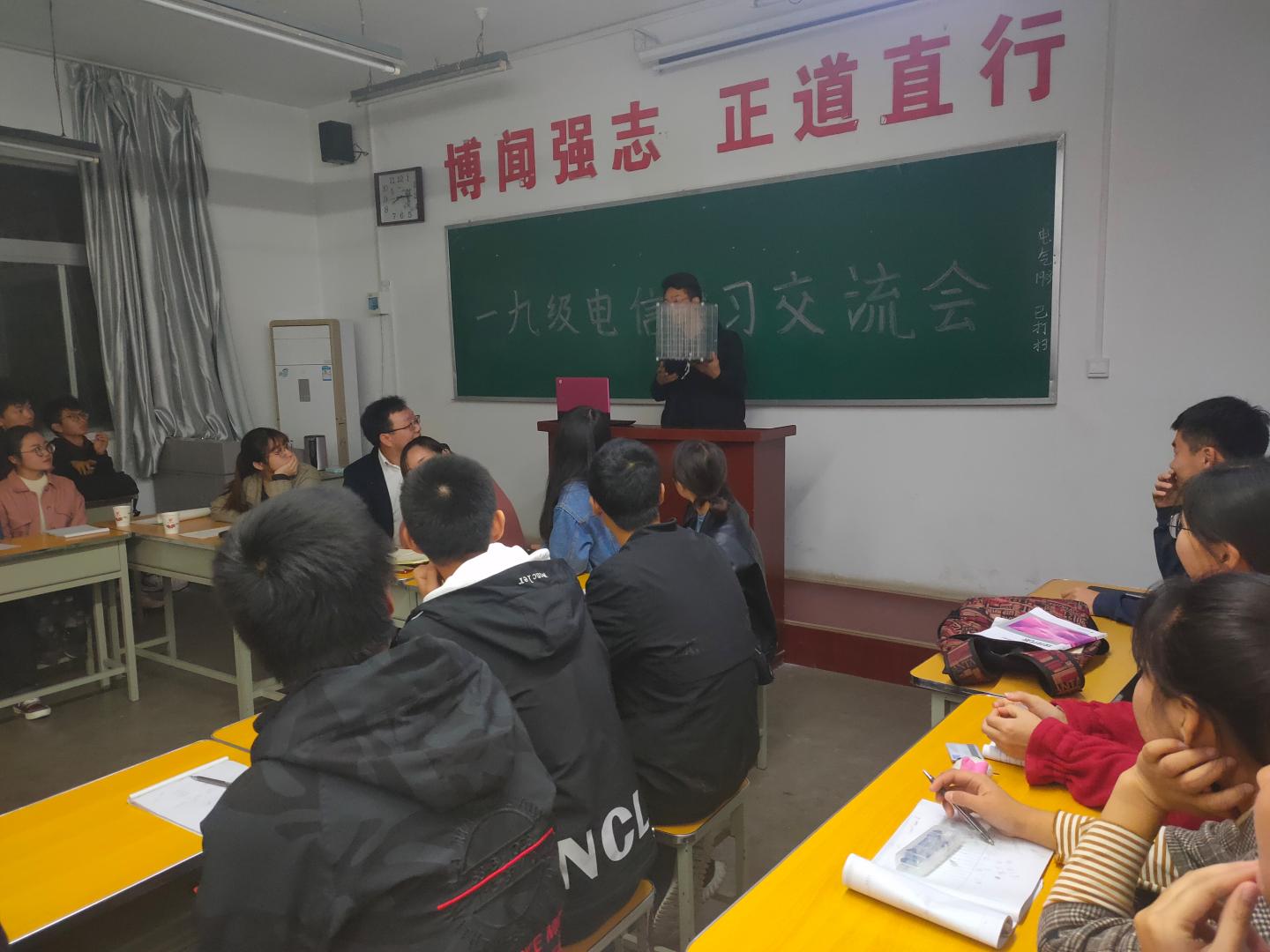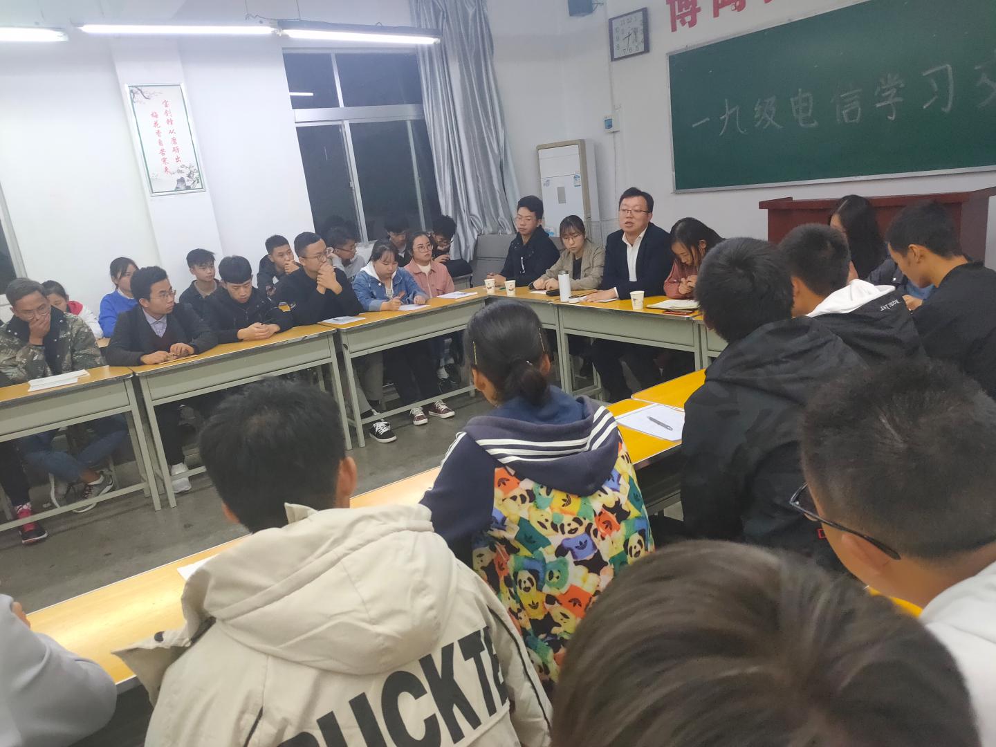 11月3日晚,太阳成集团tyc122cc在2号楼210教室组织召开2019级电子信息工程专业学习经验交流会。会议由电信1902班主任袁训锋老师主持。电信1901班主任张娜老师出席会议。电信2017级巩若琳、李娜、杨化俊和2018级王磊等4位高年级同学受邀参加学习经验分享,电信1901、1902全体同学参加会议。