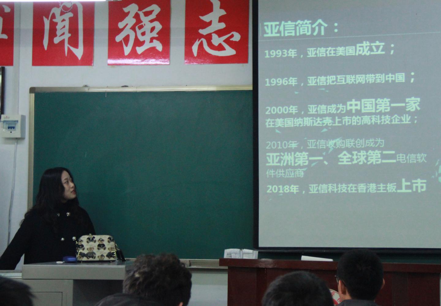 为认真落实公司毕业生就业工作,大力构建毕业生与用人单位的交流平台,积极为用人单位输送应用型人才,12月17日,太阳成集团tyc122cc于在2#201教室举办了亚信科技有限公司2020届毕业生招校园专场招聘会。此次招聘会由亚信科技人力资源主管徐乙丹宣讲。