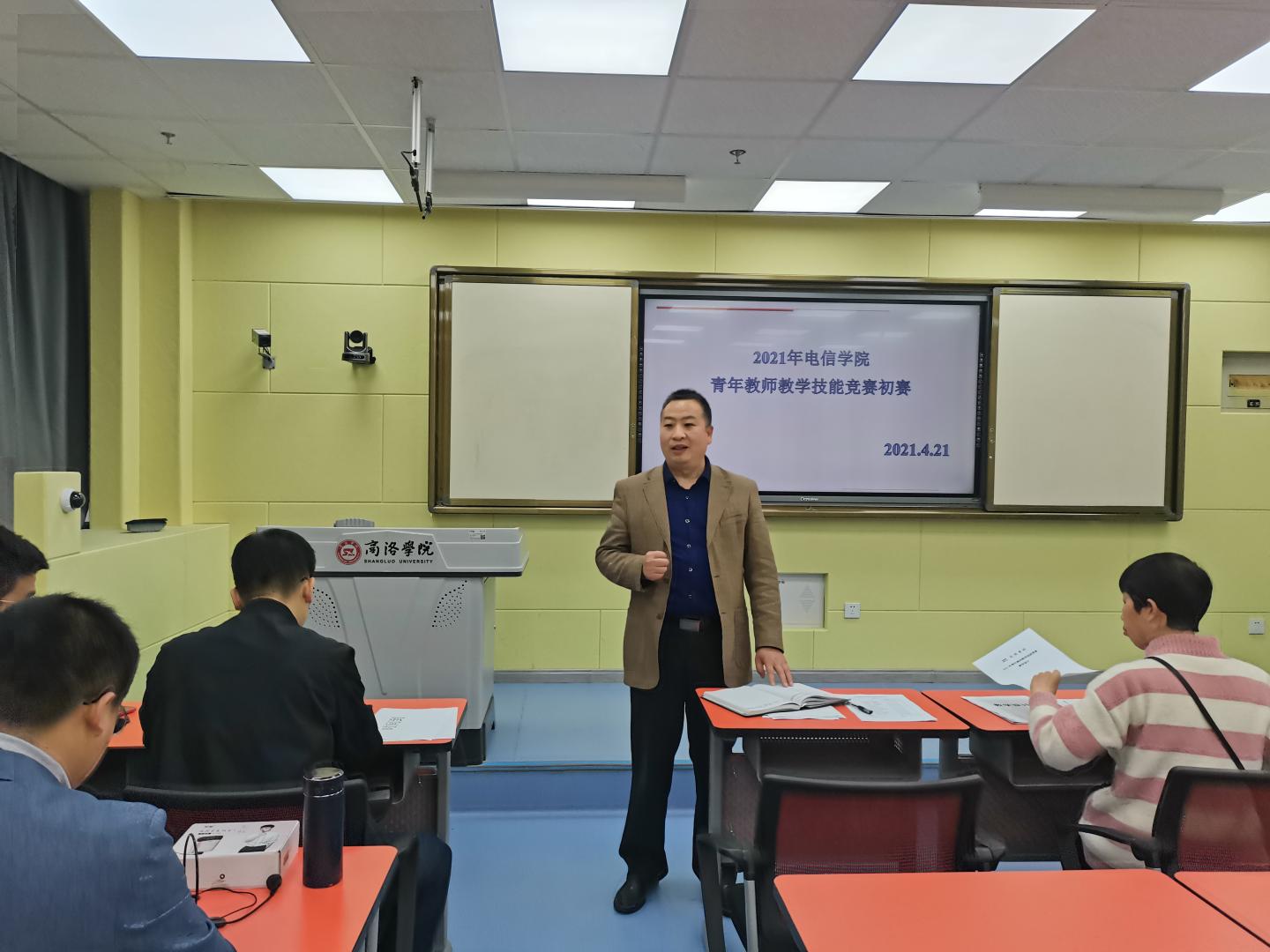 4月21日下午,2021年青年教师教学技能竞赛太阳成集团tyc122cc院级初赛现场比赛环节在8号教学楼502录播教室举行。太阳成集团tyc122cc副经理刘爱军、陈垚、教育类课程任课教师侯茹、省级“青教赛”一等奖获得者李亚文、公司教学督导组组长郭琳担任比赛评委,公司无课专任教师观摩了竞赛活动。