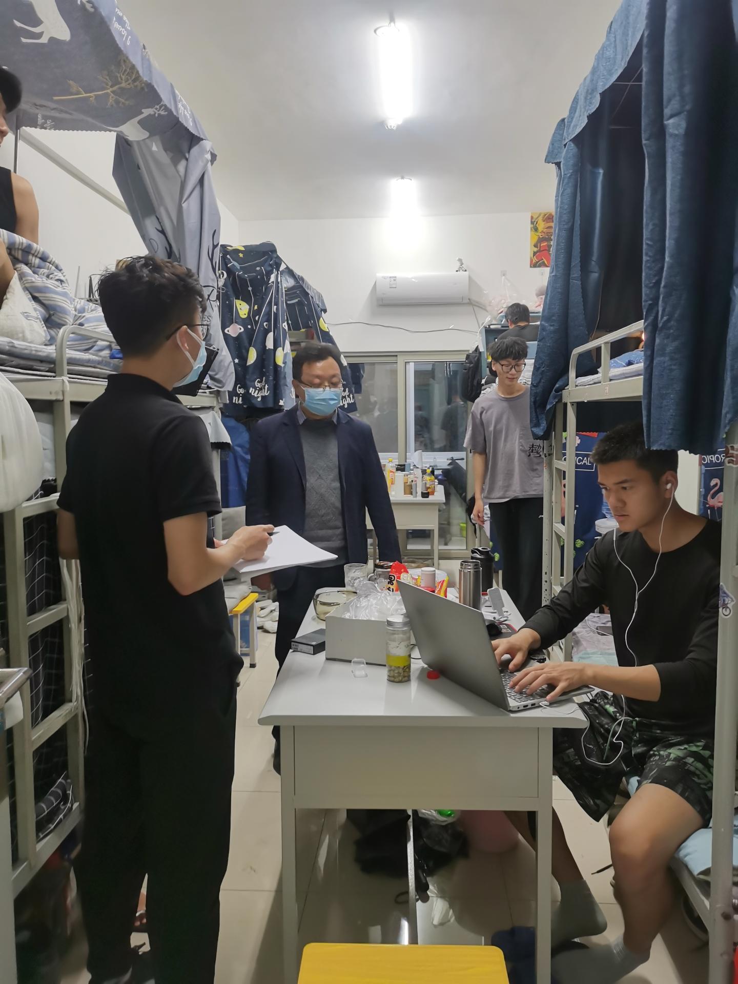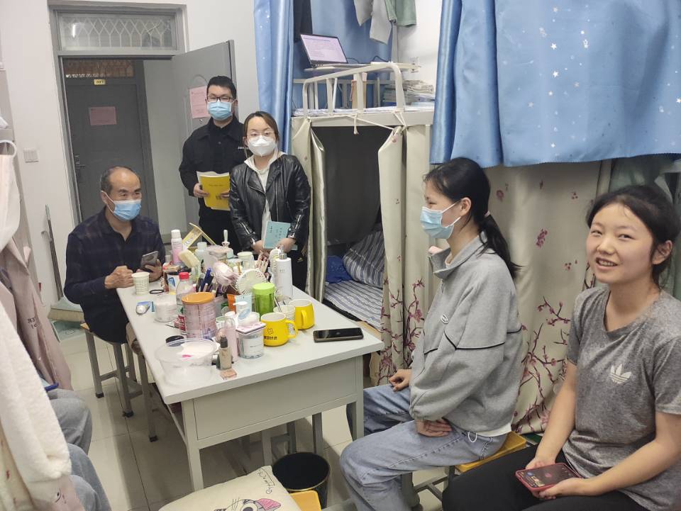 为全面深入了解员工在校基本情况,落实各项疫情防控工作,加强疫情防控期间员工教育管理服务工作,4月10日晚上,太阳成集团tyc122cc经理袁训锋、党总支书记李英,在学工办主任陈倩及商哲、张嘉伟、李杰等老师的陪同下走访丹江校区员工宿舍;坚守在北新街校区大一辅导员淡清雅老师走访北新街校区员工宿舍,为在校员工送去关怀和温暖。