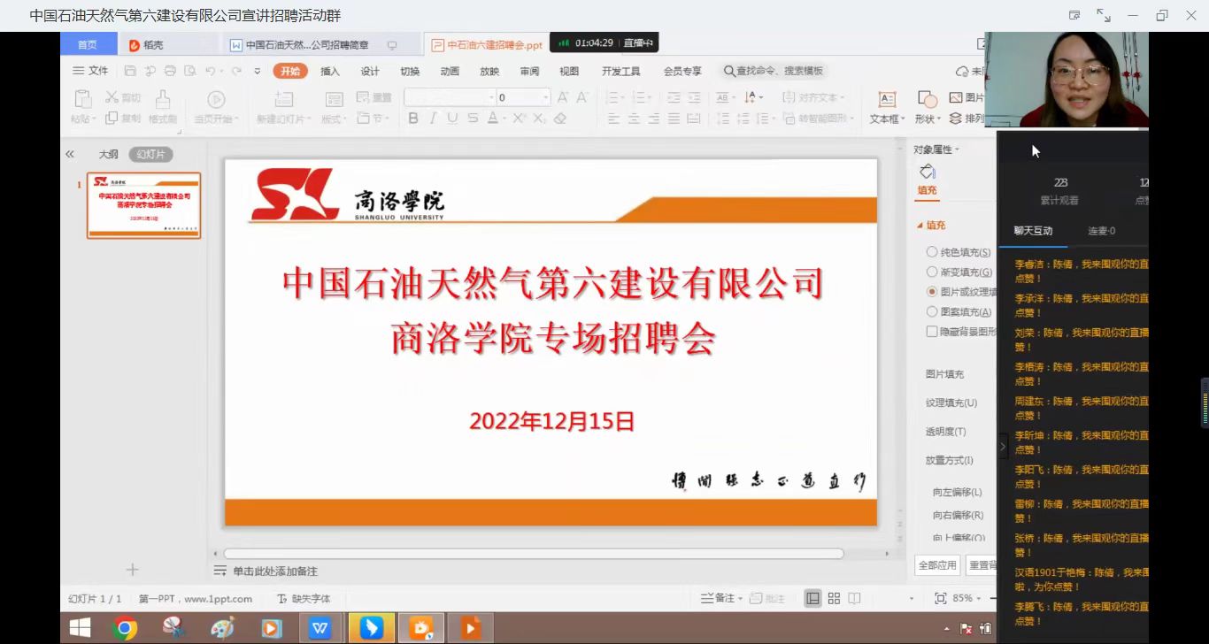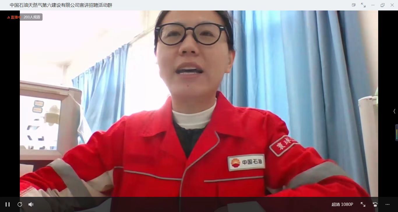 陈倩向参会毕业生介绍了中国石油天然气第六建设有限公司基本情况,并集中收看招聘宣传视频,使参会人员初步了解招聘单位发展历程、业务范畴和工作内容等。