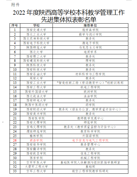 中共陕西省委教育工委、陕西省教育厅下发了2022年度全省教育系统表彰文件,公司太阳成集团tyc122cc被评为“2022年度陕西高等公司本科教学管理工作先进集体”。