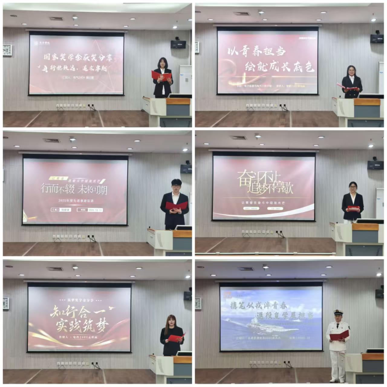 宣讲环节,国家奖学金获得者潘欣蕾、国家励志奖学金获得者田家谋、筑梦奖学金获得者孟欣雨、优秀员工干部梁丽丽、十佳老员工杨高梓楠、优质兵员储备基地训管骨干杨元元等六名优秀学子登台分享,从不同角度讲述了个人在攀登路上的心得与感悟,他们用实际行动诠释了何为“有理想、敢担当、能吃苦、肯奋斗”的新时代青年品质。
